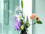 Elegant Floral Arrangement Featuring Lush Lavender, White Lilies, and Soft Coral Blooms