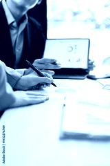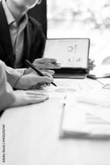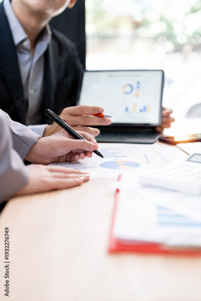 Close-up of business team analyzing financial growth charts and data reports on office desk during meeting.