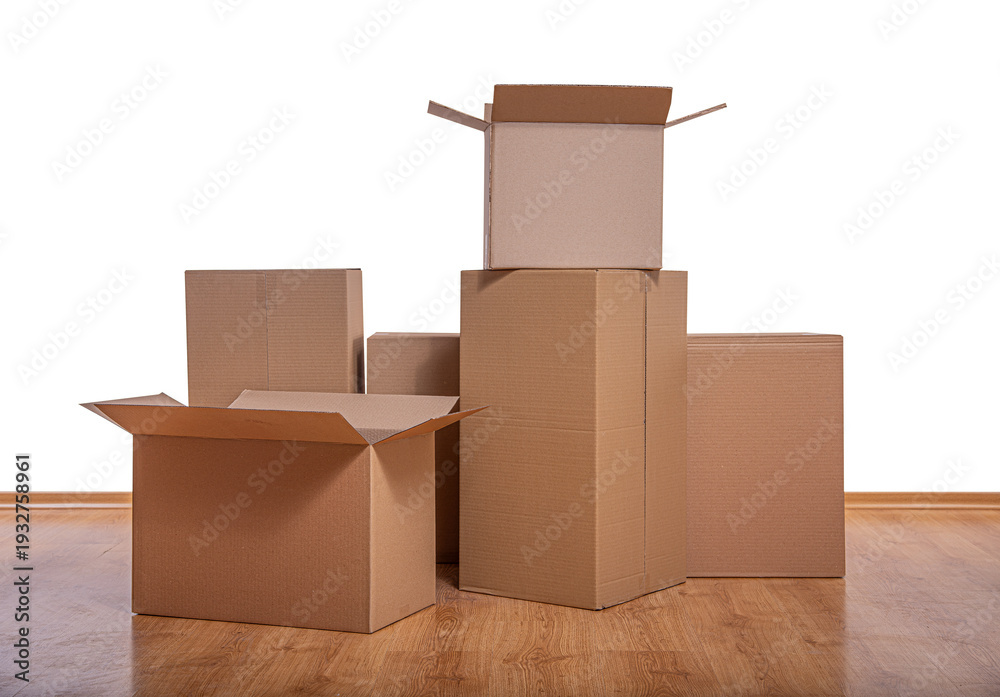 Stack of cardboard boxes on a wooden floor against a white background, suggesting a concept of moving or relocation.