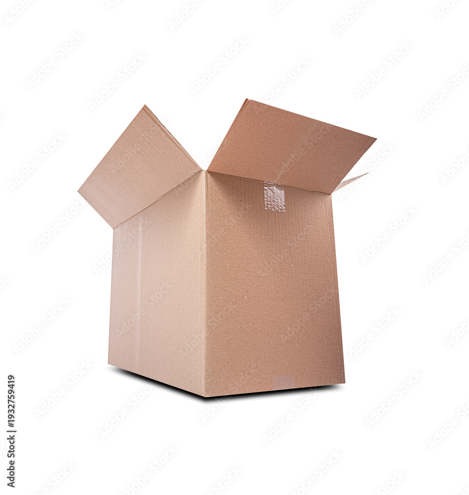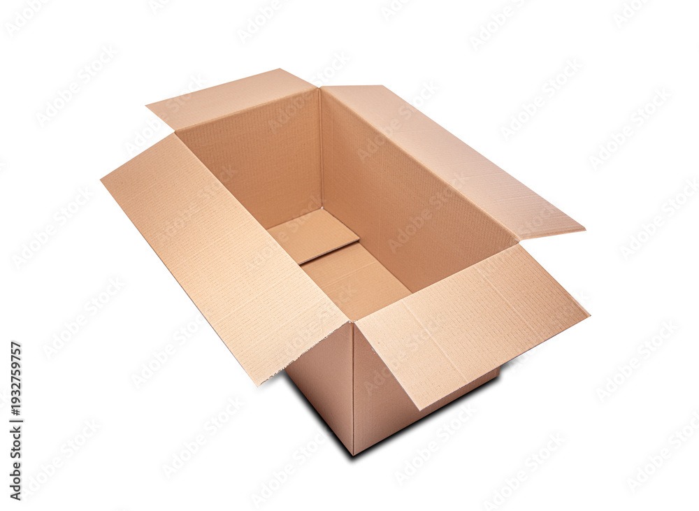 An empty open cardboard box is shown from a high angle against a plain white background.