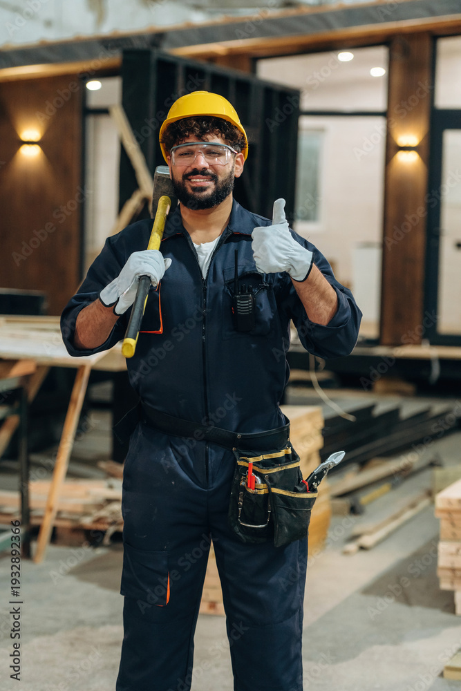 Everything is fine, showing thumb up. Portrait of a male carpenter posing in a woodworking workshop