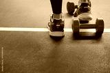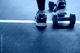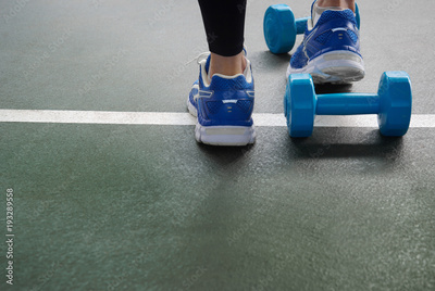 girl feet in sport shoes with blue dumbbell on dark green gymnasium floor background