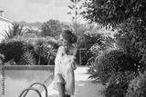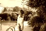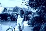 Beautiful, sexy, sensual and hot blonde model girl in peignoir posing half naked near swimming pool