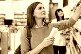 A young woman examines the ingredients on a medicine box while shopping in a modern pharmacy with a pharmacist working in the background.