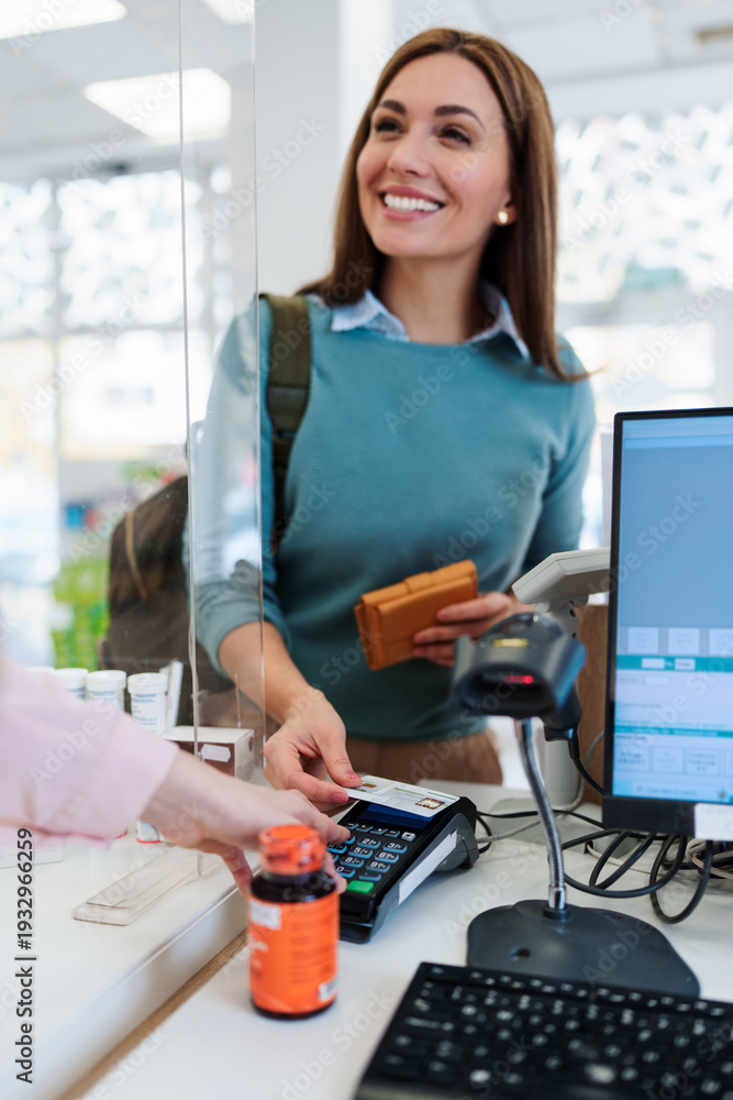 A happy female customer uses a contactless payment method at a drugstore checkout counter while a pharmacist prepares prescription medicine behind a protective glass shield.
