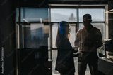 Two business employees converse in a dim office, silhouetted by sunlight through blinds. A quiet, professional scene of collaboration and discussion.