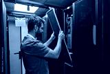 IT technician replacing air filter panel in a server room rack during data center maintenance and hardware service