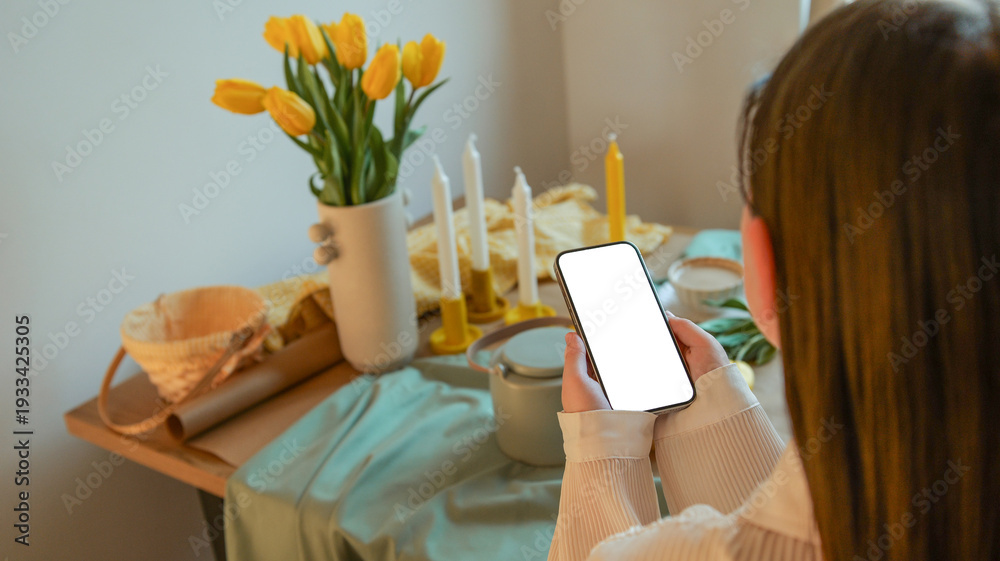Woman holding a smartphone with a blank screen in front of a table with tulips and candles