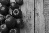 Fresh ripe red apples on wooden table, flat lay. Space for text