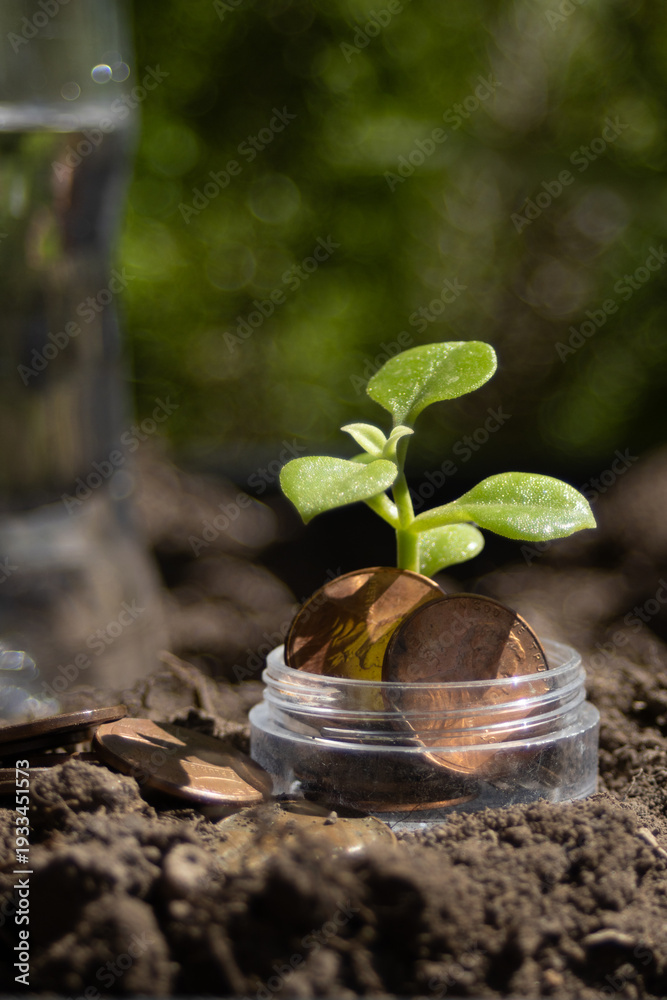 Young plant sprouting from a small jar of coins in rich soil, symbolizing sustainable finance and eco growth