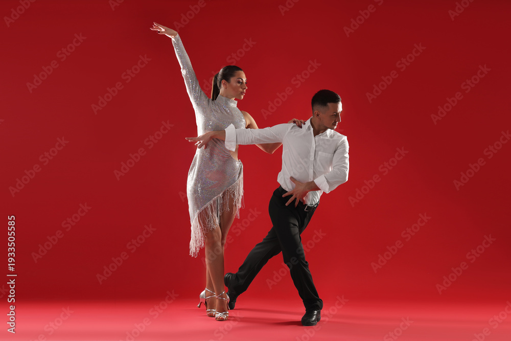 Couple of professional dancers on red background