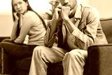 Family problem concept. Tension in relationship between married couple, husband and wife staying sitting separate after quarrel in the living room.