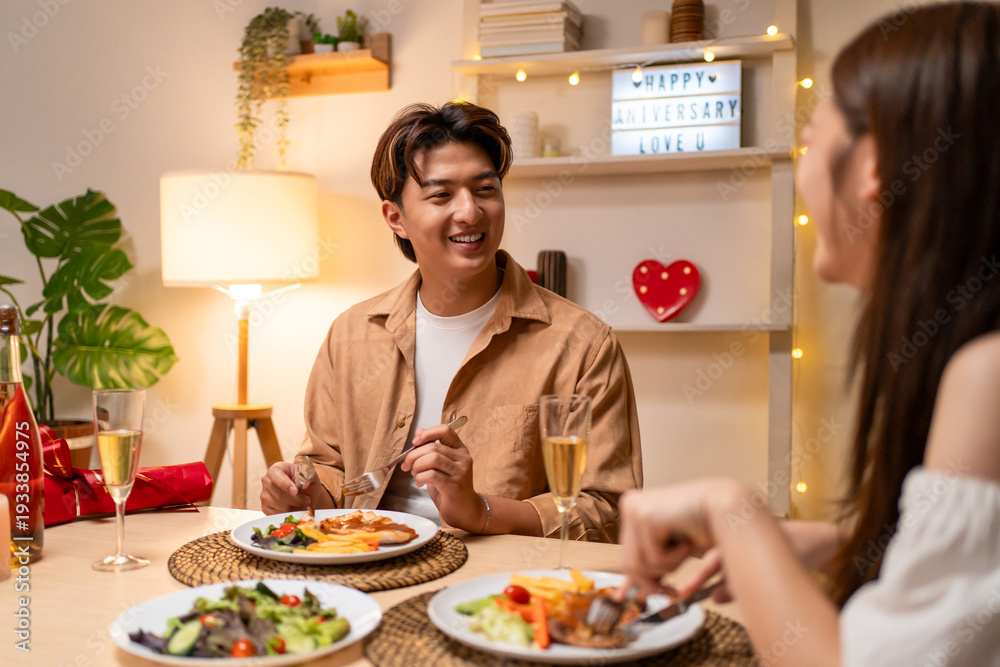 Asian romantic couple having dinner, celebrate valentine's day together.