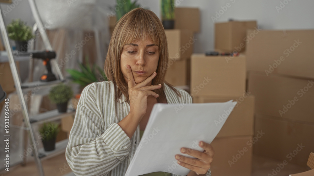 Woman holding a stack of papers, hand pressed to cheek and frowning while reading documents amid cardboard moving boxes, ladder and plants in a building; worry.