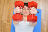 Concept of exercise and healthy lifestyle. Middle-aged woman in sportswear doing fitness exercises