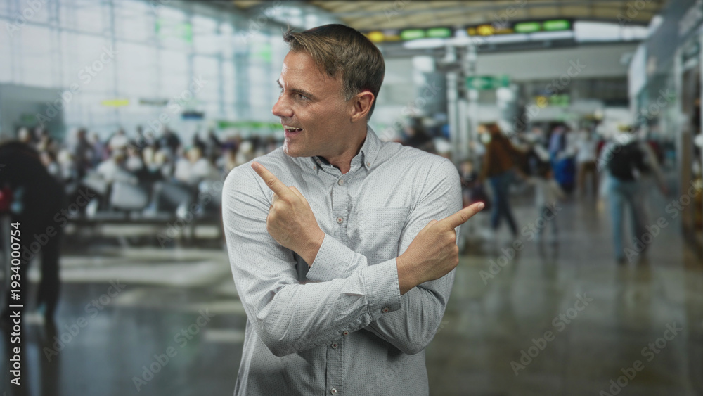Man points index fingers both directions at airport signage while crossing arms and smiling, hands visible; decision uncertainty.