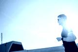 Runner enjoys morning jog under bright sun near modern building while wearing fitness gear and sunglasses