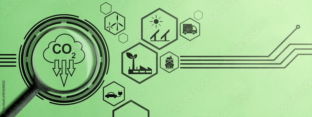 Carbon reduction featuring a magnifying glass over a CO2 icon surrounded by symbols for solar power, wind energy, green transport, and industry on a light green background