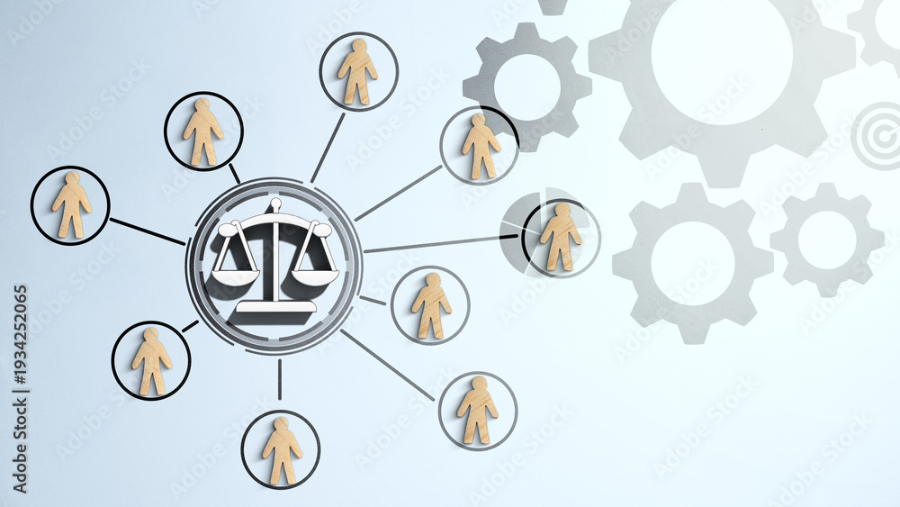 Conceptual image featuring a central scale of justice connected to human figures, symbolizing legal equality, social justice, and ethics within a societal or corporate framework