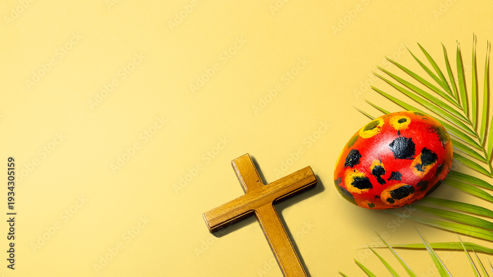 Painted red Easter egg with black and yellow patterns, a simple wooden Christian cross, and a green palm frond on a bright yellow surface. A minimalist flat lay symbolic of Easter and Palm Sunday