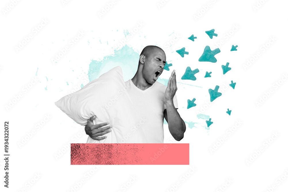 Composite photo collage of tired sleepy american guy hold pillow yawn ready sleep day off relax bed time isolated on painted background