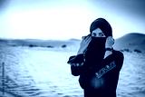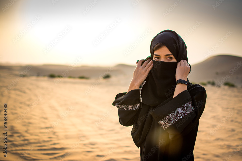 Portrait of a young Arab woman wearing traditional clothing in the desert.
