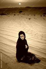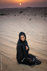Beautiful Muslim woman sitting in the desert during magnificent sunset.