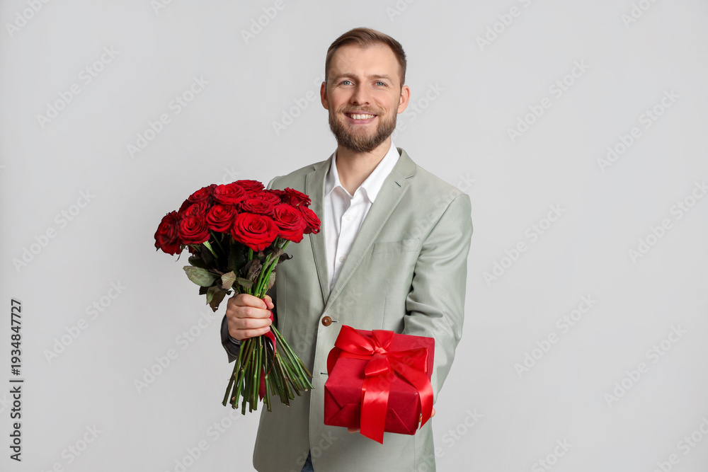 Man with bouquet of red roses and gift box on light grey background