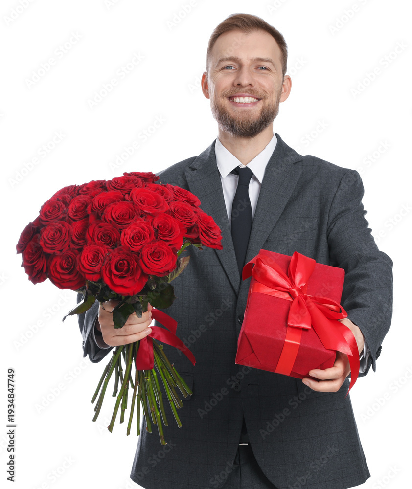 Man with bouquet of red roses and gift box on white background