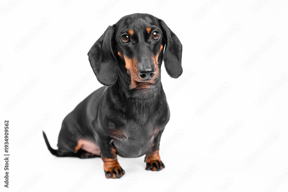 A black and tan dachshund dog sitting on a white background with a relaxed posture, ears flopped down and head slightly tilted in a calm and composed manner
