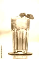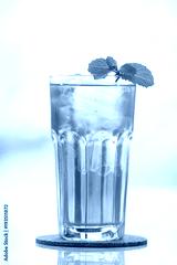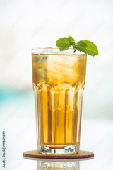 Glasses of iced tea mint on wooden coaster background .