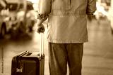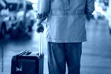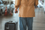 Back view of a young traveler pulling a black suitcase while walking through an airport or transport terminal during the day, representing modern mobility, global travel trends, journey