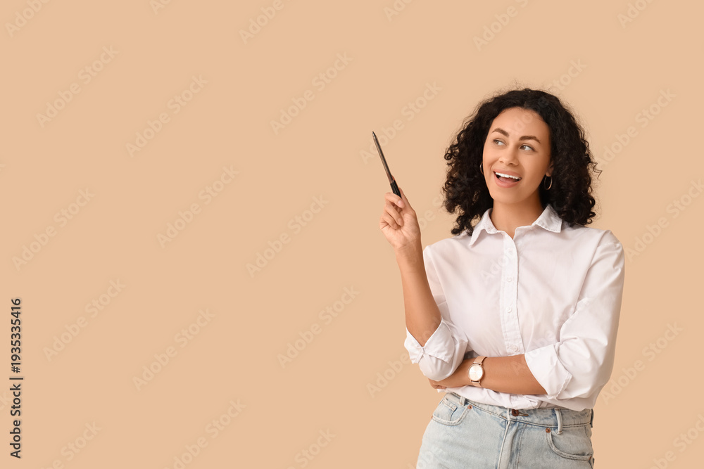 Female African-American job applicant with pen pointing at something on beige background