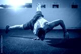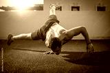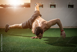 Young athletic man balancing while doing a one hand push up and holding his body in the air outdoors.