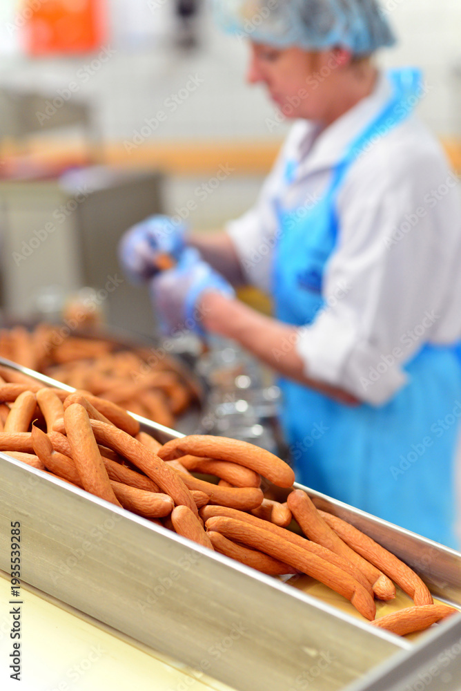Production of sausages on a conveyor belt in a large meat processing plant - Industrial food processing - Workers in work clothes