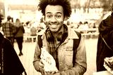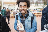 Portrait of happy pleased african-american blogger holding sandwich and smiling at camera, being excited to taste it, walking across food festival in local park. Hungry guy stops to order something