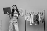 Young woman model with laptop and fashion rack smiling on bright yellow background