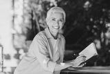 Confident elderly woman enjoying the outdoors writing in a notebook in a casual green shirt with urban park trees and city buildings