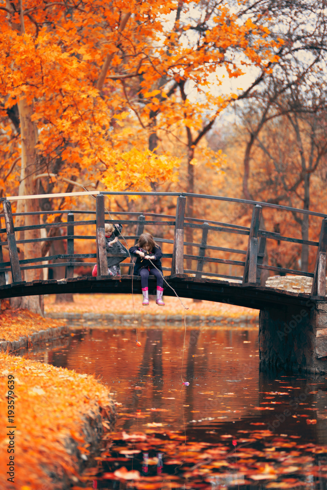 Two little girls sitting on wooden bridge and pretend fishing; autumn background