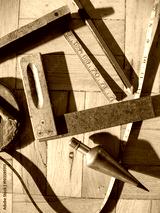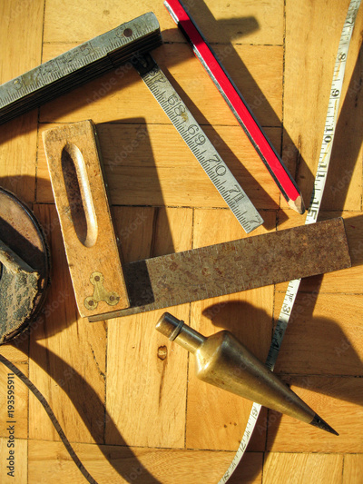 A variety of vintage measurement tools: folding ruler, square, brass plumb bob, tape measure and pencil represent measurement, accuracy, and precision