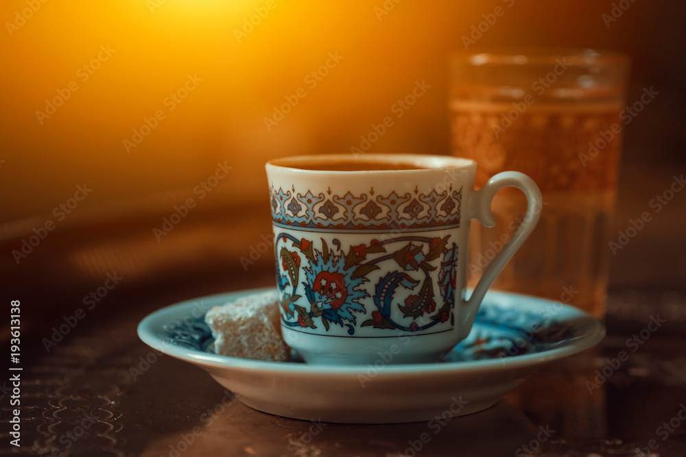 traditional turkish coffee served with porcelain chinaware cup,turkish delight and glass of water