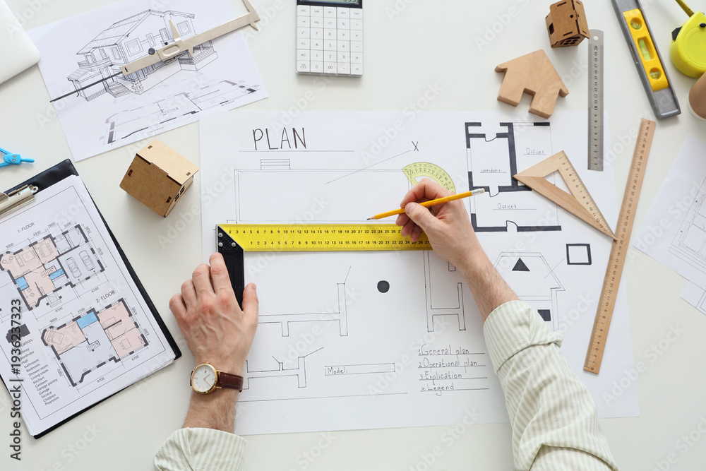 Male hands with ruler drawing zoning plan on table, top view