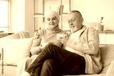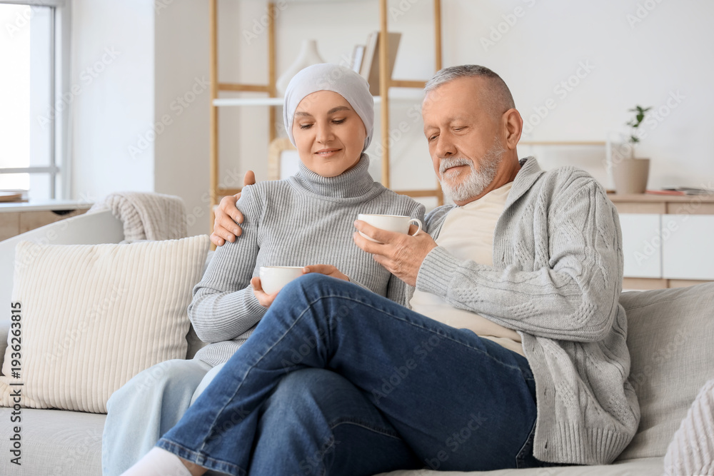 Mature woman after chemotherapy with her husband drinking tea on sofa at home