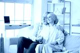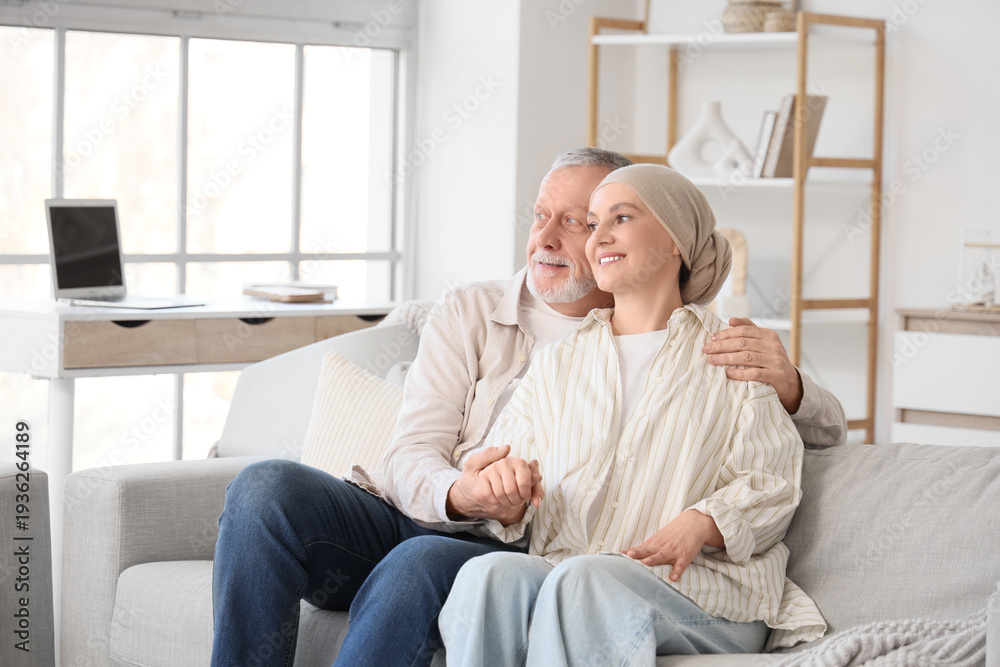 Mature woman after chemotherapy with her husband hugging on sofa at home