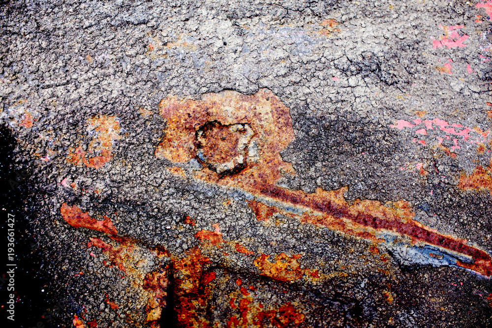 metal background of natural metal bent and beaten surface with old shabby paint of different colors, scratches rust and corrosion formed by time and weather
