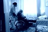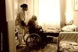 Black woman assisting senior Caucasian man with disability in wheelchair moving near bed in residential room, social worker supporting elderly client during daily routine