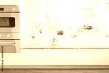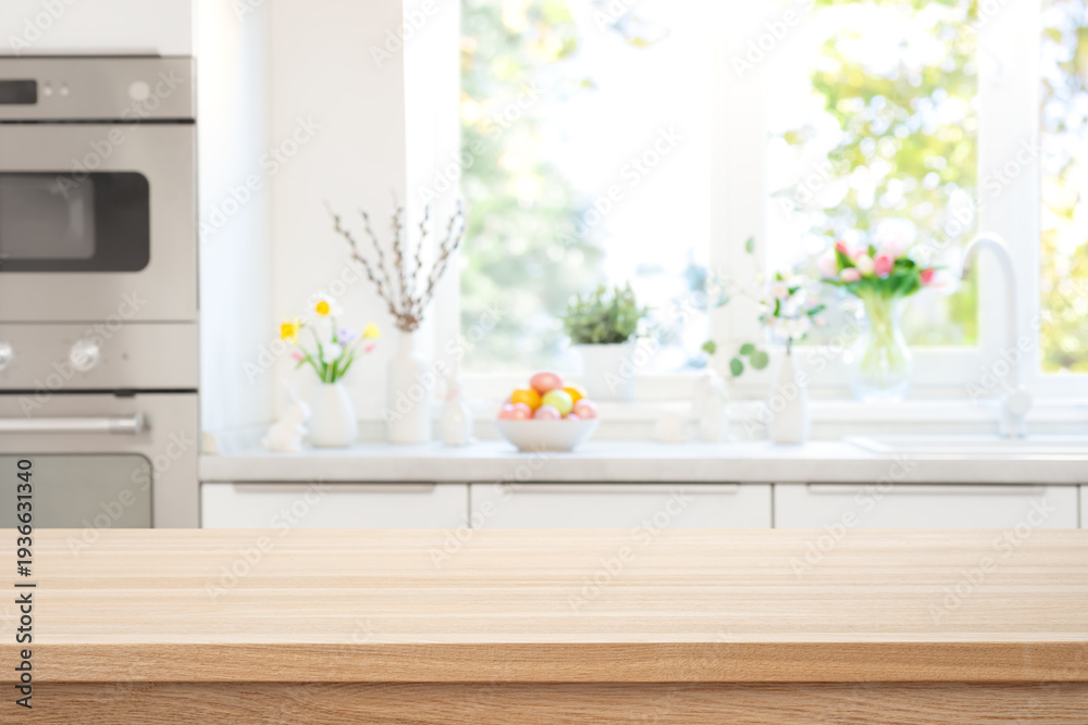 Wooden table top view for product presentation on blurred kitchen interior background with Easter decoration