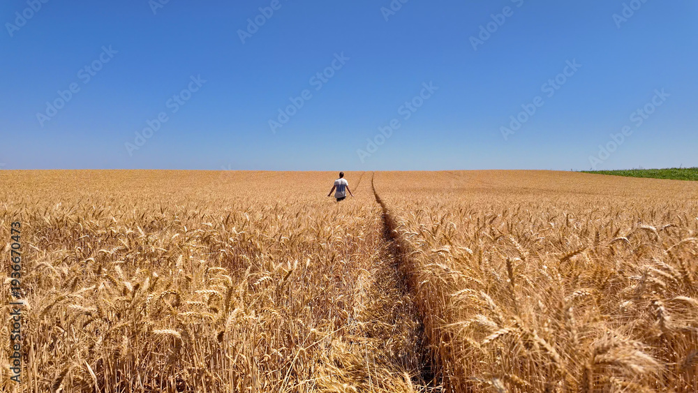 Man touching fresh wheat on the farm.