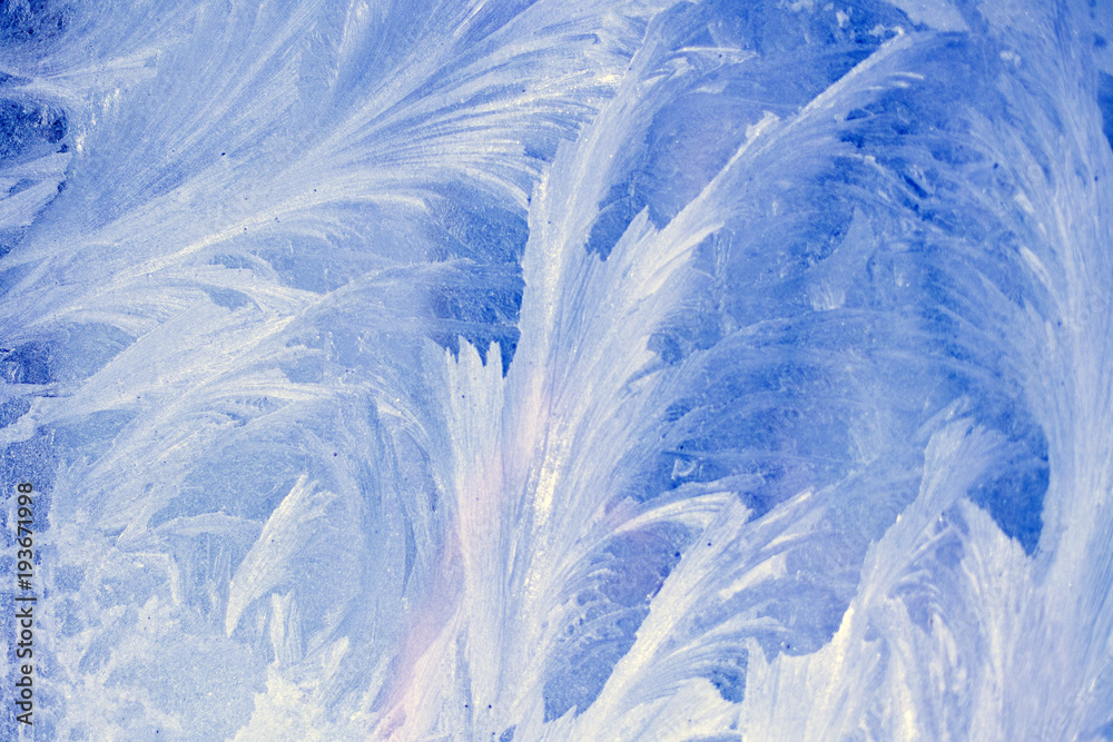 Текстура красивого ледяного узора на стекле сине-белого цвета