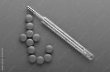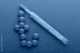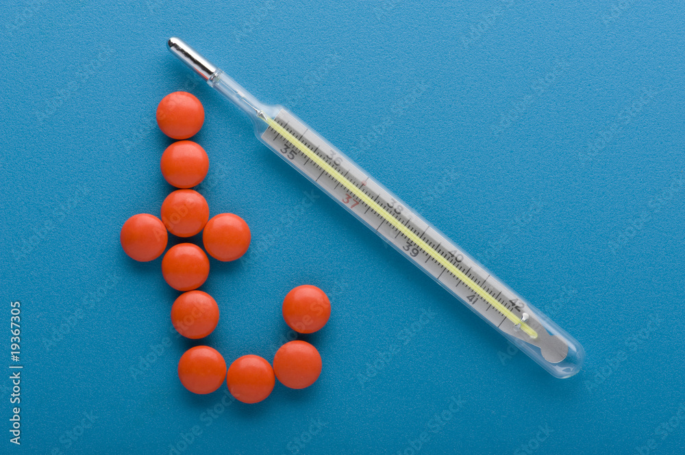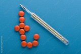 Tablet and thermometer on blue